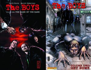 After the opening story arc introducing Hughie to the team (issues 1-6), Dark avenger Tek-Knight and his ex-partner Swingwing are in trouble (issues 7-14). Big trouble. One has lost control of his terrifyingly overactive sex-drive, and the other might just be a murderer. It’s up to Hughie and Butcher to work out which is which, in Get Some. Then, in Glorious Five-Year Plan, The Boys travel to Russia – where their corporate opponents are working with the mob, in a super-conspiracy that threatens to spiral lethally out of control. Good thing our heroes have Love Sausage on their side.